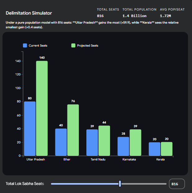 As mentioned earlier, if the government redistributed Lok Sabha seats based strictly on today's population (using the 2011 or upcoming census), Southern states would lose a massive share of their political power because they successfully controlled their population growth, while Northern states would gain immense power. To prevent the South from being punished for its successful governance, the government has proposed abandoning the strict population-to-seat mathematical formula. Instead, they plan to apply a flat, across-the-board 50% increase to the current seat count of every single state. The overall size of the Lok Sabha will increase by 50%, jumping from the current 543 seats to around 816 seats. Under this model, Uttar Pradesh's seats will increase from 80 to 120. Simultaneously, Tamil Nadu's seats will increase from 39 to 59, and Kerala's will increase from 20 to 30.