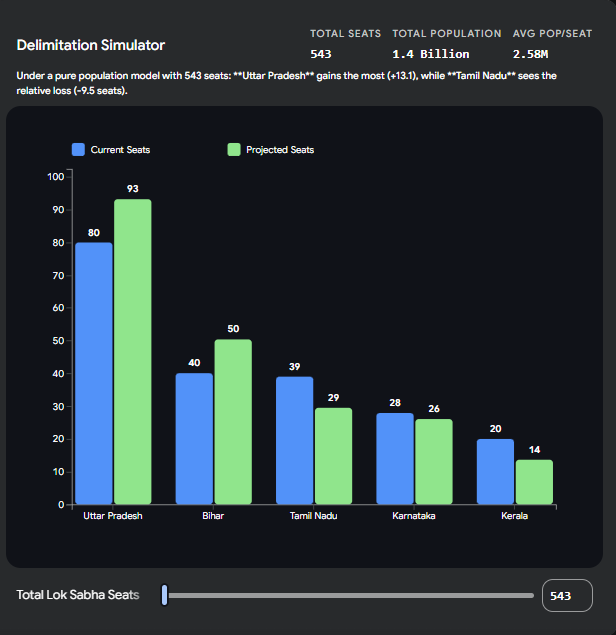 Because a representative in Uttar Pradesh serves 3 million citizens, while a representative in Kerala serves 1.75 million, the actual "weight" or "value" of a single voter's voice in the North is significantly diluted. The obvious solution is to unfreeze the seats and redraw the maps based on current populations. However, doing this creates a different, arguably more dangerous kind of inequality: punishing effective governance. When analyzing the history of institutional management in India, Southern states like Karnataka, Tamil Nadu, and Kerala successfully implemented national directives on education, family planning, and public health. This effectively stabilized their populations. Conversely, states in the Hindi heartland saw massive population surges over the same 50-year period. If seats are redistributed strictly by today's population numbers, the states that governed best will lose their national political voice. They face a massive "demographic penalty" for their success, while states that failed to control population growth are rewarded with immense, disproportionate political dominance in parliament.