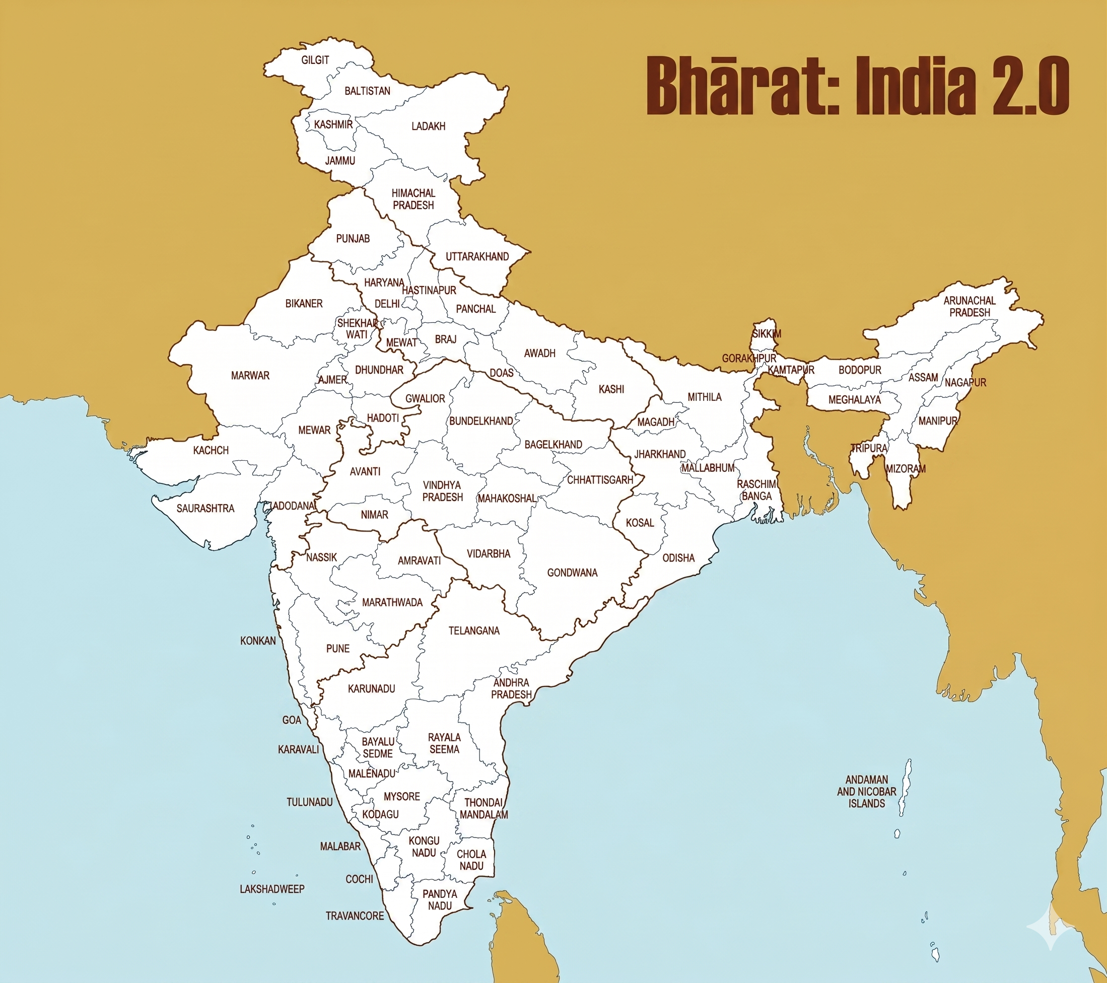 In the book Bhārat: India 2.0, the author, Gautam Desiraju, argues that the current state sizes are too large to properly capture the nation's rich diversity. The central proposal of the book is a demarcation of India into seventy-five states with roughly equal populations of approximately two crores (20 million) each. The primary objective of this exercise is administrative convenience and the optimal expression of national diversity. New state boundaries should be determined by a logical, rather than political, analysis of geography, history, culture, language, and religion. NOT JUST LANGUAGE. The author suggests respecting historical regions (e.g., Mithila, Rayalaseema), tribal belts (Gondwana), and restoring the borders of well-administered Princely States (e.g., Mysore, Travancore).