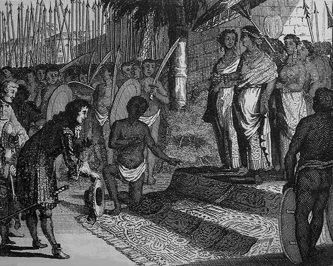 The viceroy of the king of Travancore, called by them Gorepe, the chief commander of the Negroes, called Mattia del Pule, and myself, set out for the court of the queen of Koulang, which was then kept at Calliere. We arrived there about two o’clock in the afternoon, and as soon as notice was given of our arrival, we were sent for to court, where, after I had delivered the presents, and laid the money down for pepper, I was introduced into her majesty’s presence. She had a guard of above 700 soldiers about her, all clad after the Malabar fashion, the queen’s attire being no more than a piece of calico wrapped round her middle, the upper part of her body appearing for the most part naked, with a piece of calico hanging carelessly round her shoulders. Her ears, which were very long, her neck and arms were adorned with precious stones, gold rings and bracelets, and her head, covered with a piece of white calico. She was past her middle age, of a brown complexion, with black hair tied in a knot behind, but of a majestic mein, she being a princess who showed a great deal of good conduct in the management of her affairs. After I had paid the usual compliments, I showed her the proposition I was to make her in writing, which she ordered to be read twice, the better to understand the meaning of it, which being done, she asked, whether this treaty comprehended all the rest? and whether they were annulled by it? Unto which I having given her a sufficient answer, she agreed to all our propositions, which were accordingly signed immediately.”[6]